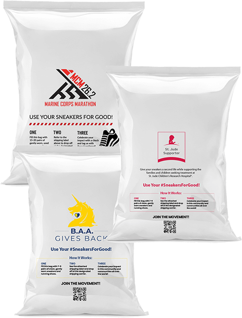 Request a free mail-in bag which holds 6-8 pairs, and we’ll cover shipping. Yes that’s right, completely free shipping. Each bag you fill not only keeps sneakers out of landfills but also supports a different community organization in need. It’s an easy way to make a difference—one pair at a time!